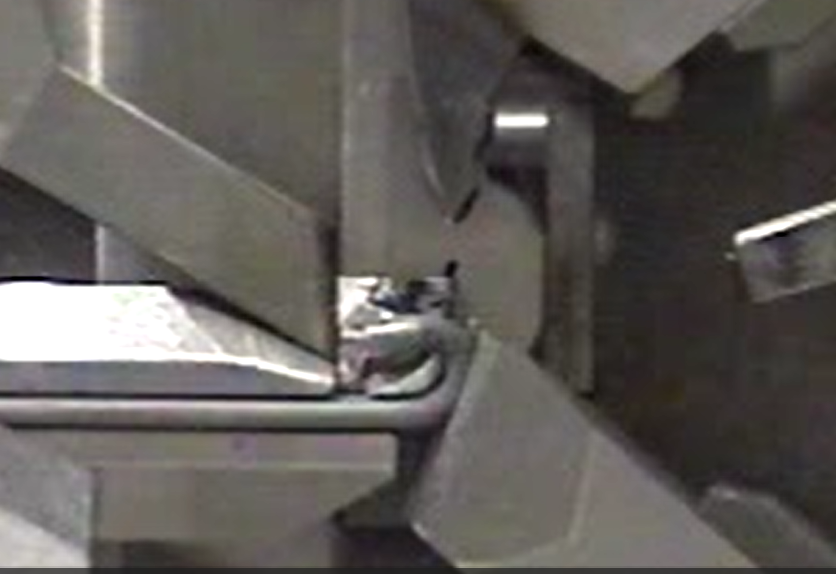 MG100による先端をコイル内側に曲げた加工です。3本のコイリングポイントが順番に曲げ加工を行い、次の先端フック(直線)に備えて、直線を残して切断を行っています。切断時に、下スライドがワイヤーを支え、上スライドで切断している点にもご注目下さい。