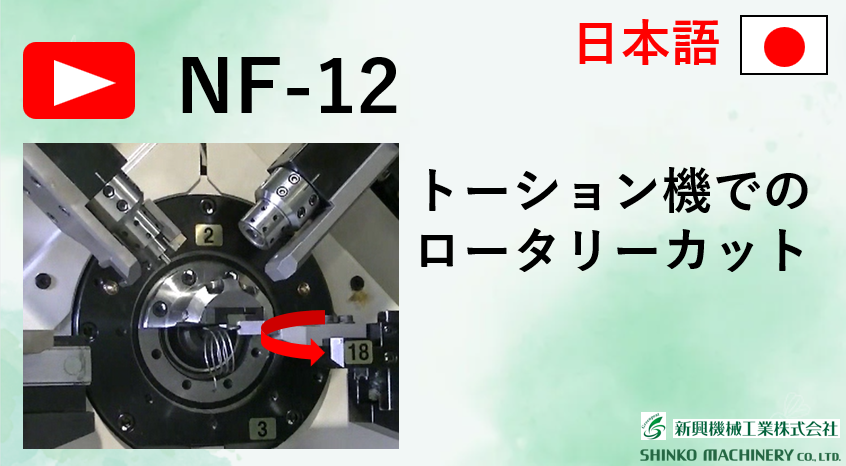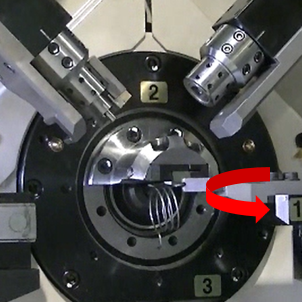 Rotary Cutting by NF12 Torsion Machine. The right slide moves slightly forward after cutting wire and when it returns back, to reduce burrs by avoiding taking the same path. Since the NF series Right & Left Slides can move back-and-forth by servo, such rotary cutting can be done on Torsion Machine. Tool shapes are also important, but we hope can be helpful.